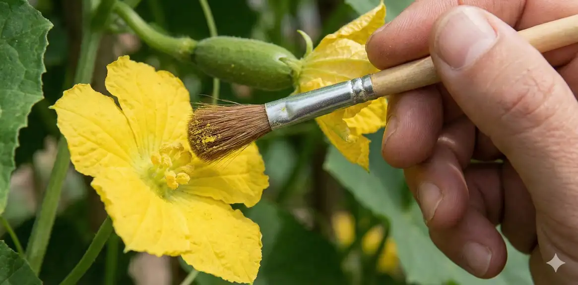 Use pollen from 2-3 different male flowers on each female for best results. This ensures plenty of pollen reaches the stigma.